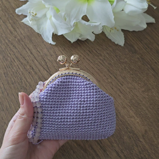 Handmade Lavender Crochet Coin Purse with Vintage Kiss-Lock Clasp and Beaded Strap